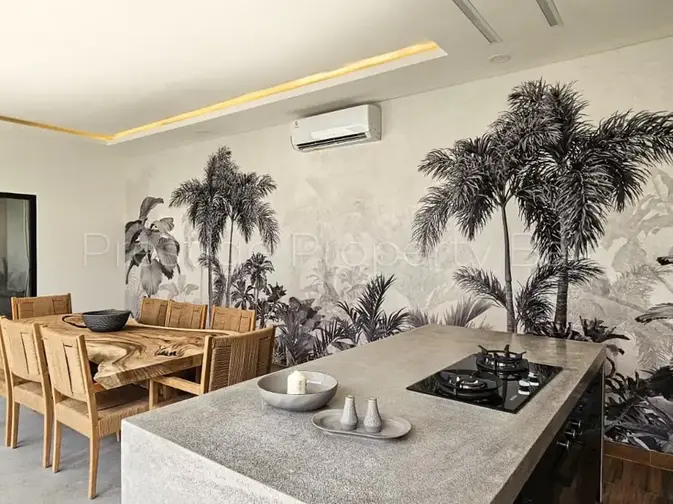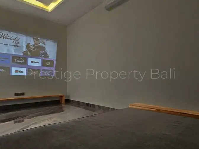 The semi-open living area connects to a fully equipped kitchen, providing a practical and comfortable setting for daily living. A private cinema room adds a unique touch for at-home entertainment.
