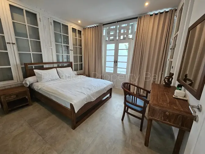 The villa features a fully enclosed living area, allowing for comfort and privacy in an air-conditioned space. Outside, you’ll find a private swimming pool and a well-maintained garden—perfect for enjoying Bali’s tropical atmosphere.